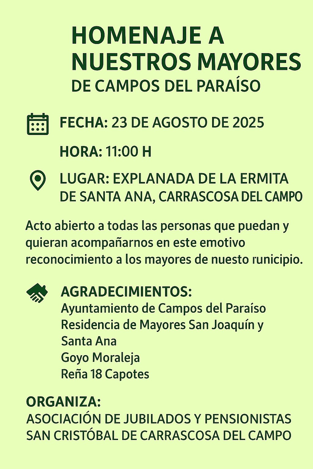 Como ya sabéis, el pasado sábado 23 de agosto de 2025, la Asociación de Jubilados y Pensionistas San Cristóbal de Carrascosa del Campo llevó a cabo un emotivo acto en reconocimiento a todos los mayores de 93 años, destacando su labor social y agradeciendo todo lo que han aportado a lo largo de sus vidas.